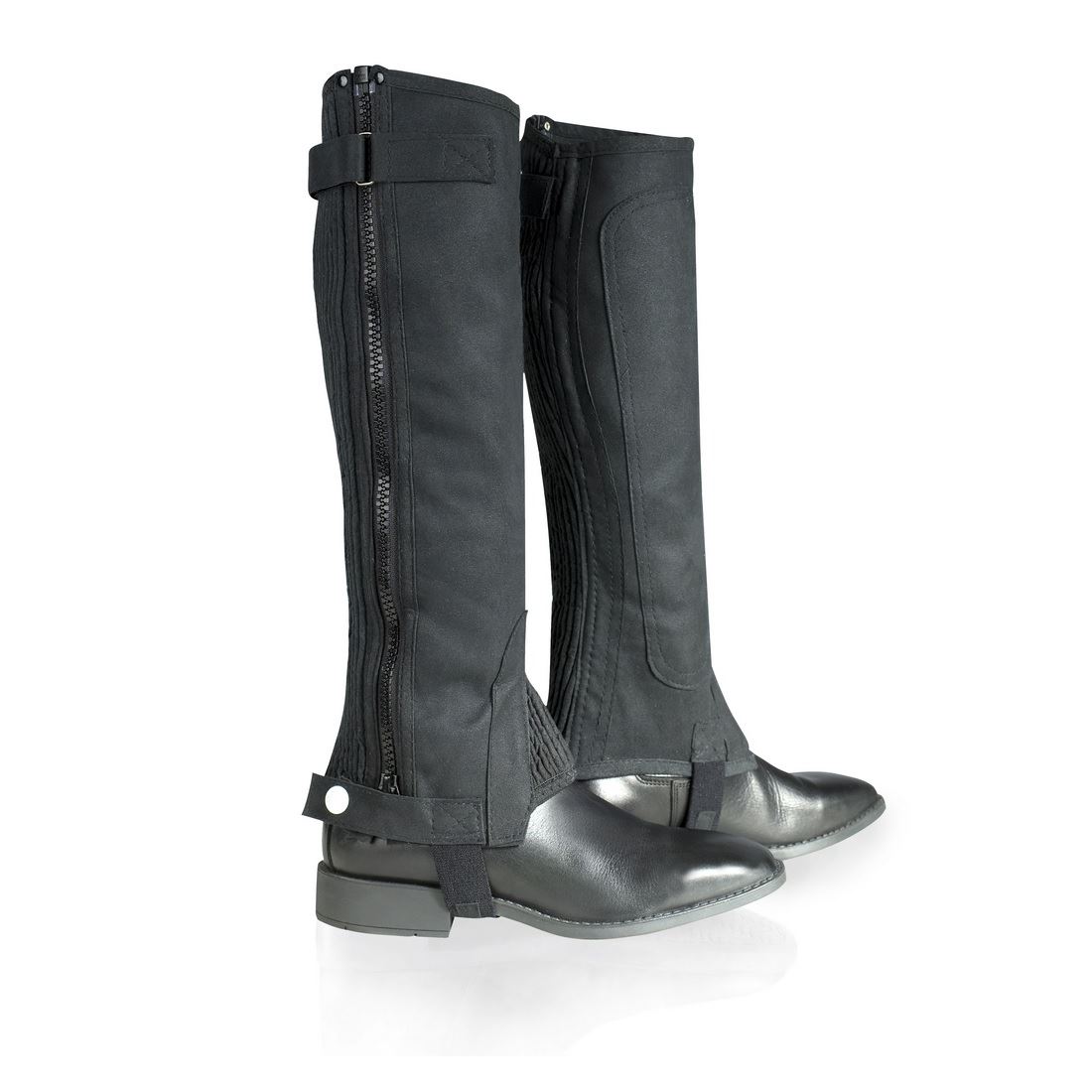 Synthetic suede chaps with elastic sides and a velcro strap at the top.
