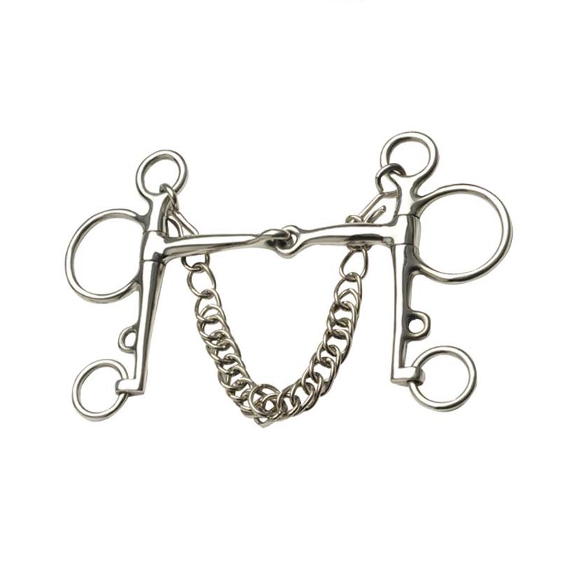 Stainless Steel. Single jointed mouth pelham bit complete with double link curb chain.