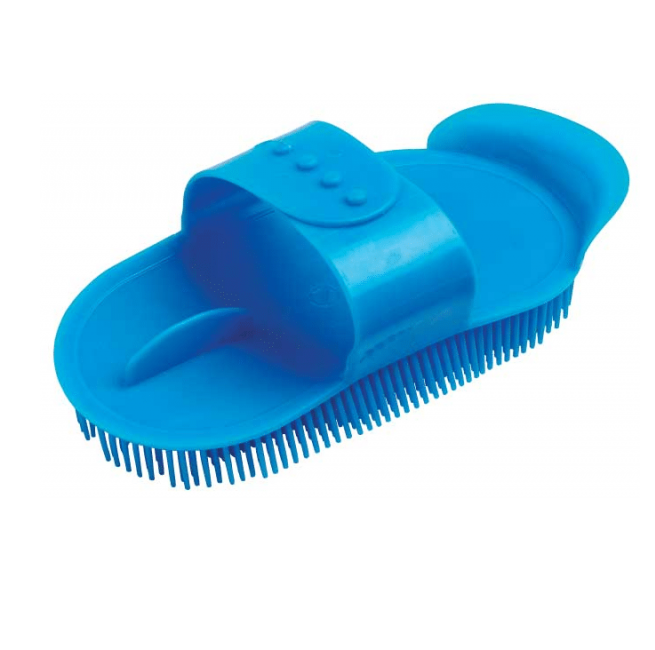 Plastic sarvis curry comb with adjustable hand strap. The flexible bristles help to shift deep seated mud and grit.