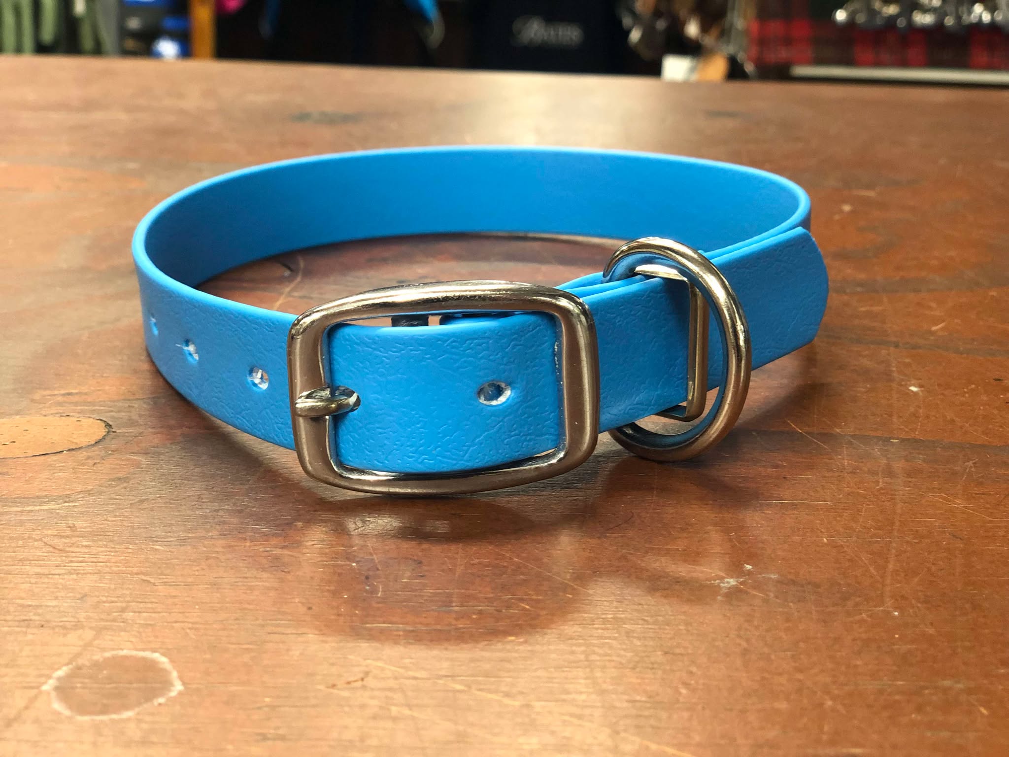 We make our dog collars in full grain leather or PVC.