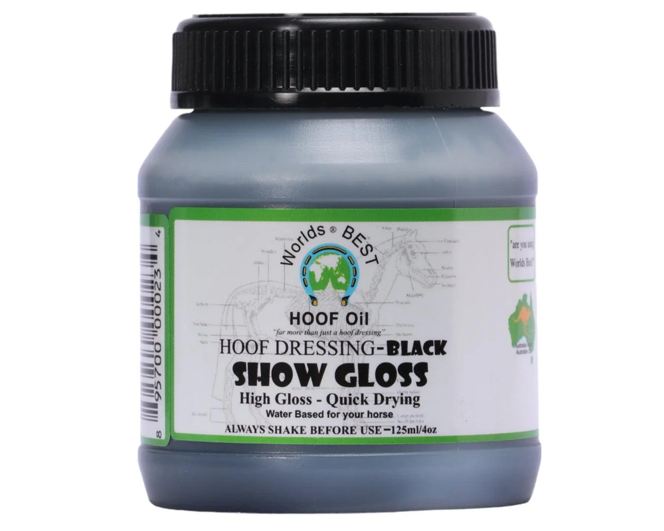Worlds Best Hoof Oil Show Gloss is a water based, high gloss, quick drying show ring dressing.